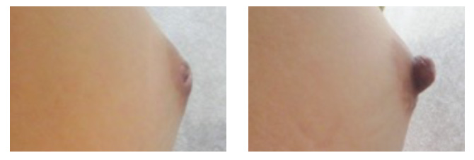 【回答】使う前は陥没していたけれど、こちらを、つけて、吸引すると、陥没していた、乳頭がでてきました。こちらの、ローションと、セットで使うと本当に悩みがすこし、解決できました。吸引器はとても軽いので持ち運びにもとても便利だし、外出先でも使えるので役に立ちます。ローションも、いただいたものが小さいサイズだったので、持ち運びも便利でとってもよかったです。一か月続けていくと、本当に効果が出てくるんだなあと、実感しました。ローションの香りがなんとなく、バラの香りがしてとっても、わたしは、バラの香りがすきなので使っていくうちにとても癒されました。授乳もほんとに、スムーズにできるようになったので、感謝です。陥没は、ほんとに長年の悩みでこちらが、あることも知らなかったのでこちらの商品があると知れただけでとても、嬉しいです。持ち運びも便利だし、悩みも解決できたしほんとによかったです。ローションをつけて、マッサージをしてみたら、ハリもでてきて、ほんとに、よかったです。マッサージも続けて見ようかと思っています。ありがとうございました。